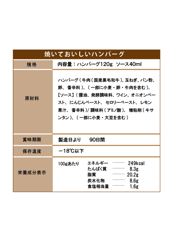 【調理方法】 ソースを冷水につけ解凍しておきます。 油をひかず、冷凍のまま、熱する前のフライパンにハンバーグをのせます。 中火で片面に焼き色が付くまで焼きます。(目安3分〜5分) 焼き色が付いたら裏返して、差し水(約30?)を流しいれ、すぐに蓋をして弱火にします。 弱火のまま7〜10分程度蒸し焼きにします。 蓋を開け、水分を飛ばし、中まで火が通れば出来上がりです。お皿に移し、ソースをかけてお召し上がりください。 ※冷凍でのお届けになります。 ※お時間や火加減はあくまでも目安です。使用する器具によって変わりますのでご注意ください。 ※調理中、油はねなどによる「やけど」にご注意ください。 ※ハンバーグを焼くときに出る油を、キッチンペーパー等で少しふき取りながら焼くと、よりキレイに仕上がります。