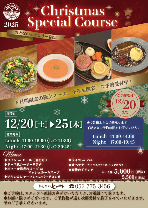 🎄✨おとなのヒッコリー限定クリスマスコースご予約受付中!✨🎁