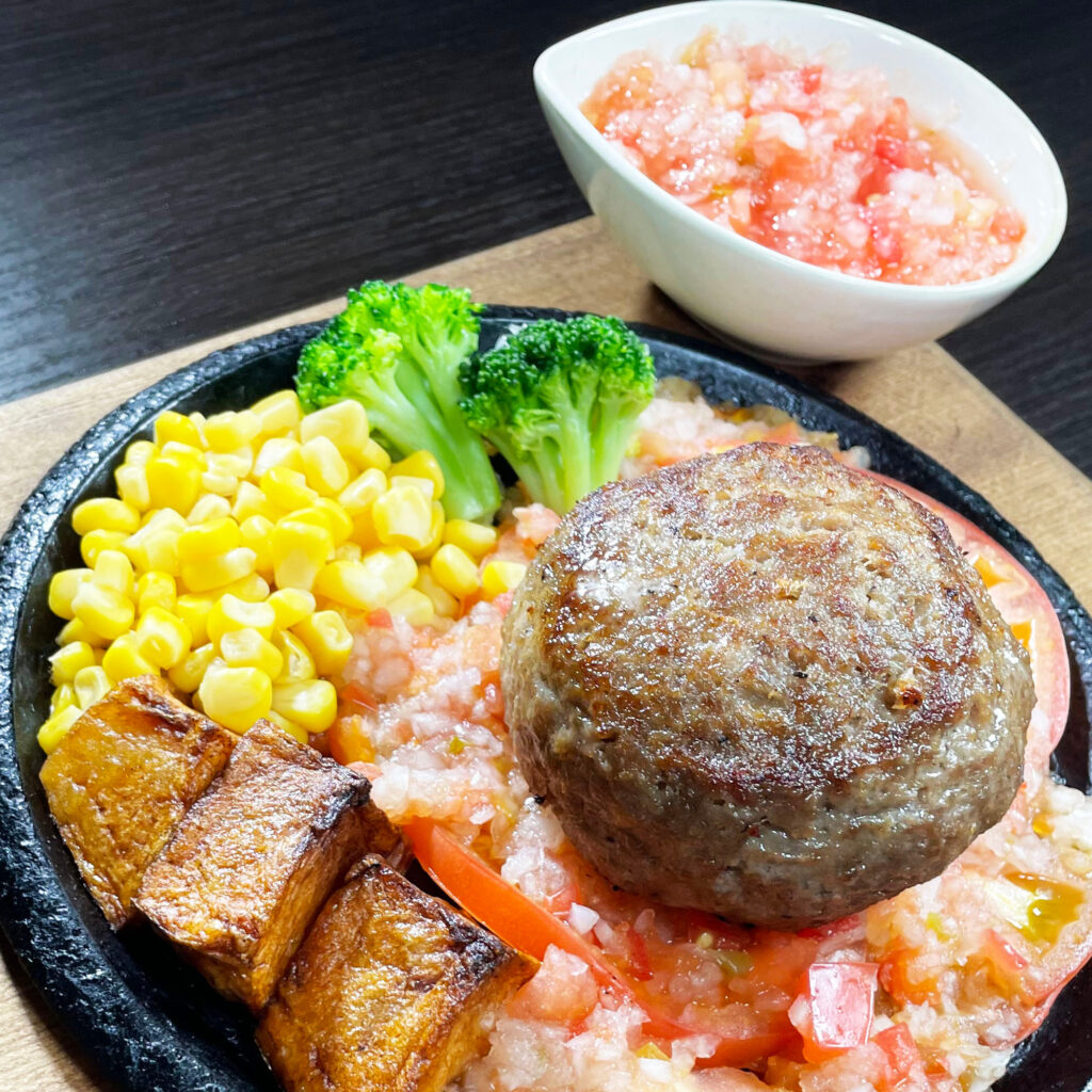 ロコモコもジャーマンで。和牛ミンチとスパイスだけで練り上げ、美味しくお召し上がりいただきます。【焼き石付】