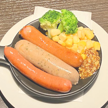 てりやきソースのハンバーグに、豚肉100%のソーセージとたっぷりお野菜。